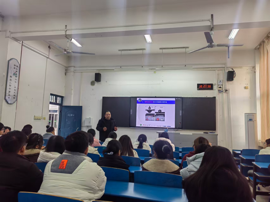 11月27日,太阳成集团tyc122cc周延彪博士在4104教室举办学术讲座,报告以“超润湿多孔材料的设计与应用”为题,太阳成集团tyc122cc化学和材料专业学生到场聆听。
