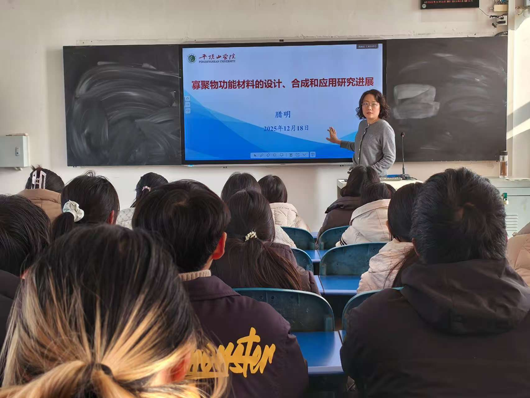 2025年12月18日下午2时,太阳成集团tyc122cc腊明博士在4403教室举办学术讲座,报告题目为《寡聚物功能材料的设计、合成和应用研究进展》,太阳成集团tyc122cc25、24和23级化学专业同学参加了此次学术活动。腊老师以“什么是寡聚物?”为引,介绍了寡聚物的定义、优点、应用前沿领域。围绕此次报告主题,详细阐述了寡聚物功能材料的研究背景、基于AI的寡聚物分子设计策略、寡聚物功能材料的研究流程,并介绍了国内外相关研究机构的最新研究成果。最后,腊老师介绍了从事寡聚物功能材料研究的国内科研机构,并鼓励大家学好专业知识,为继续深造打下坚实基础。通过此次活动,拓宽了学生的视野,激发了学生对相关领域的学习与科研兴趣。
