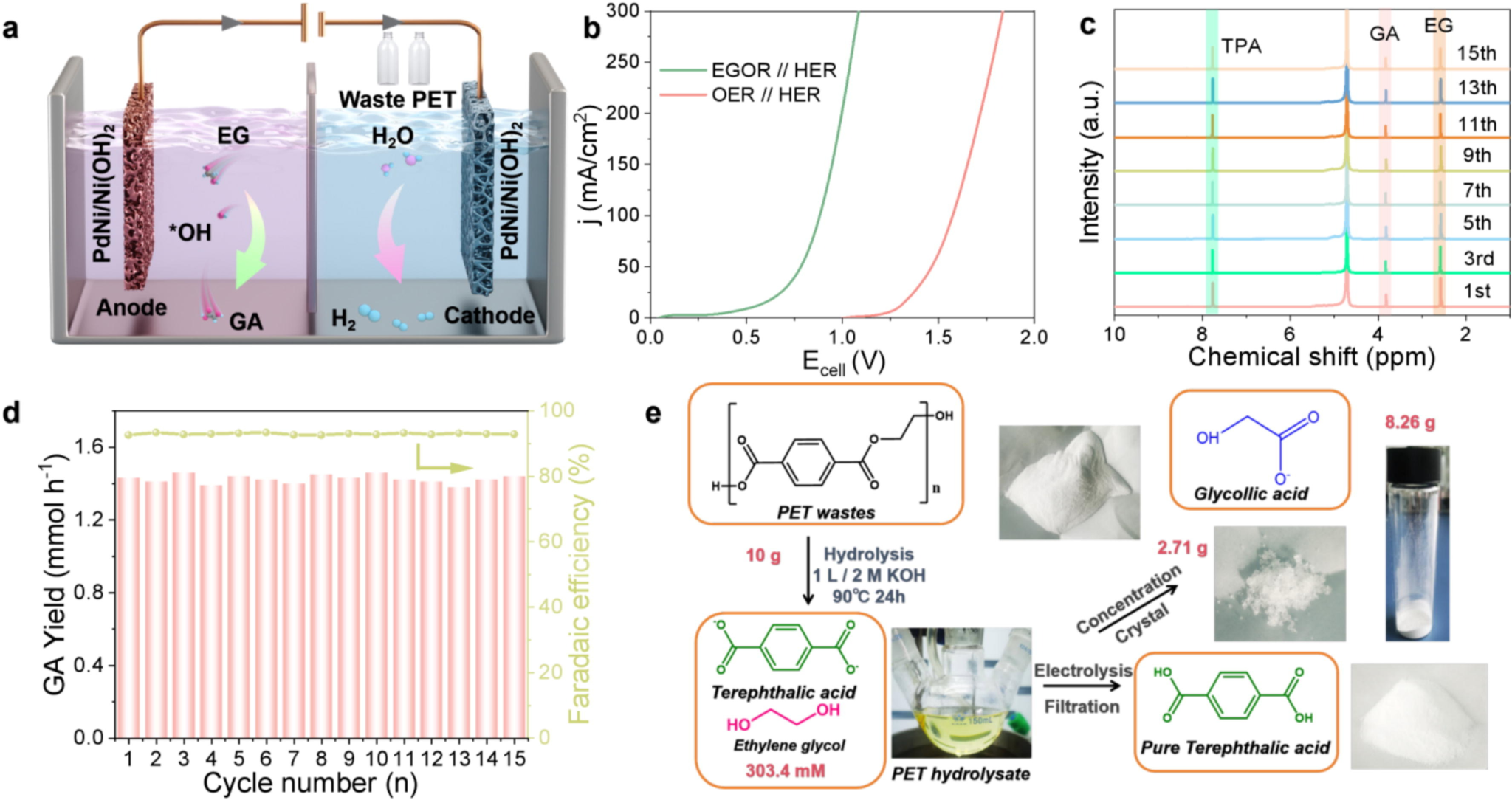 全球 PET 塑料污染日趋严重,传统机械回收与化学回收存在效率低、二次污染等难题。本研究以PET水解产物乙二醇为原料,通过合金介导关键中间体优化策略,实现废弃塑料向高附加值精细化学品的定向转化,为低碳塑料循环提供全新方案。团队采用水热合成与电沉积两步法,将PdNi合金纳米颗粒负载于Ni (OH)2纳米片,构筑高效催化界面。该体系显著提升抗CO毒化能力与循环稳定性,界面电子重构加速电荷转移,塔菲尔斜率低至98.9 mV dec⁻¹;通过强化*OH吸附、精准调控中间体转化,实现乙醇酸高选择性生成,副产物极少。在 1.0 V(vs RHE)条件下,乙醇酸产率达1.67 mmol h-1 cm-2。采用EG氧化替代传统析氧反应,在50 mA cm-2电流密度下电位降低约900 mV,大幅降低能耗。团队构建的阳极产乙醇酸、阴极联产氢气耦合体系,连续运行15次循环后效率仍保持92.9%以上,兼具高选择性、低能耗、长寿命等优势。
